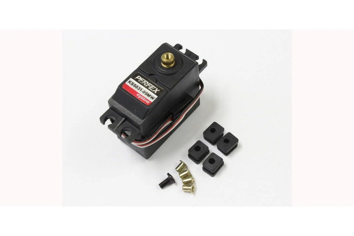 This is the Kyosho Perfex KS-5031-09MW Metal Gear Servo. This is the replacement steering servo for the Kyosho MP9 ReadySet and Mad Force Krusier 2.0, but is a good low cost alternative for any application that could benefit from a metal gear servo with 9kg-cm of torque. Package includes rubber grommets and horn mounting hardware.