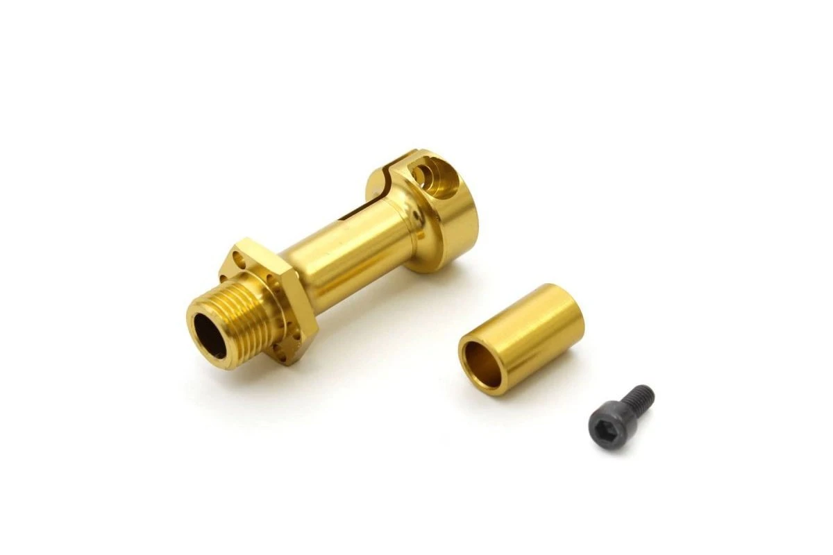 Spare part for Kyosho 1/12 Fantom 4WD. Clamp type rear wheel hub. Lightweight gold anodized hub & collar set. Prevents damage to shaft due to core deviation and screws.