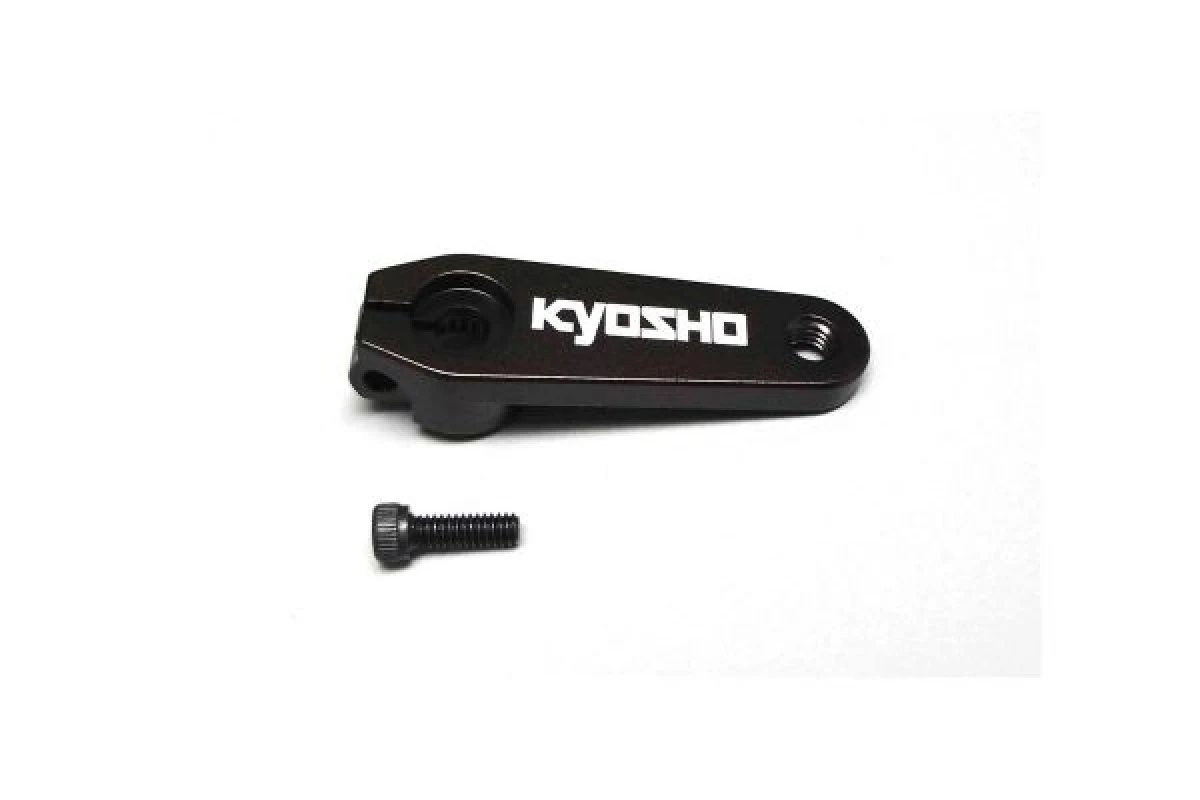 Optional aluminium servo horn for 1/8 off-road vehicles. 2mm longer horn than standard increases steering feel. Clamping screw for added security, and laser etched Kyosho logo for added bling!