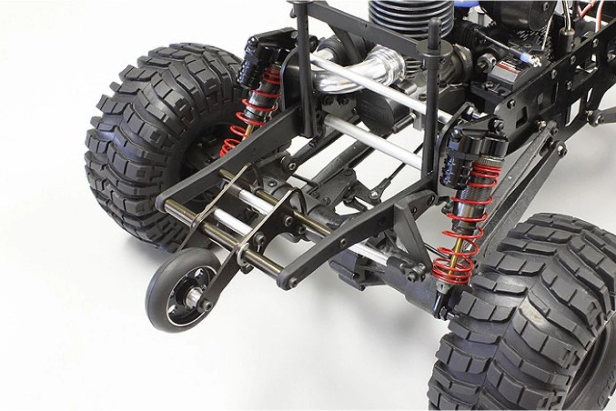 Machined aluminium wheelie bar set for 1/8 Mad Force, FO-XX and the Mad Crusher. Wheelie tire with damping design to absorb impact. Anodized in gun-metal and black.